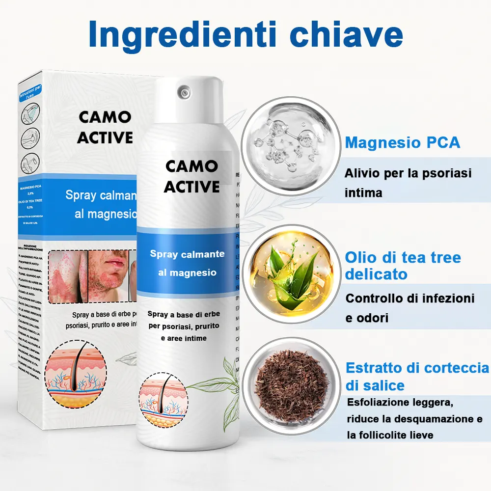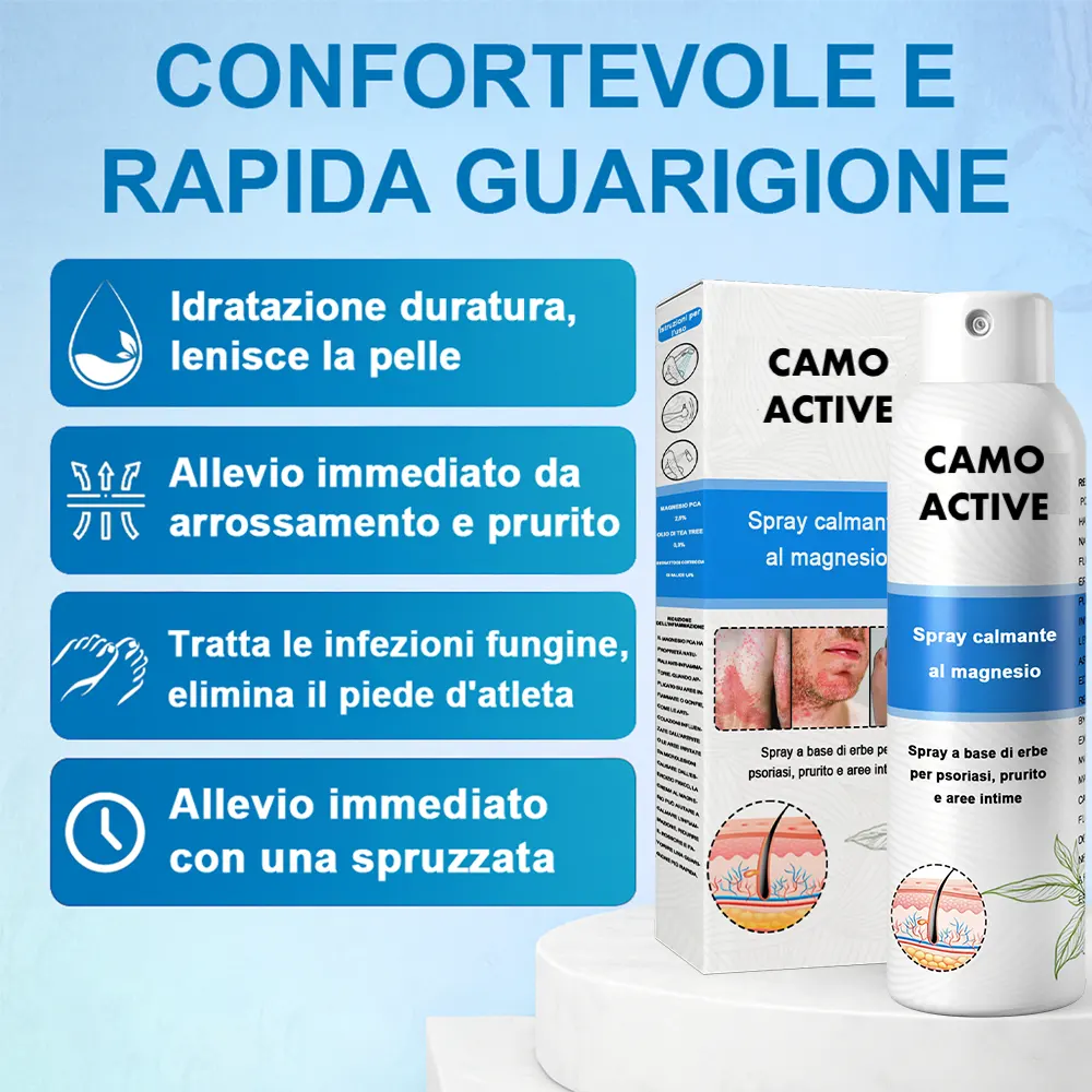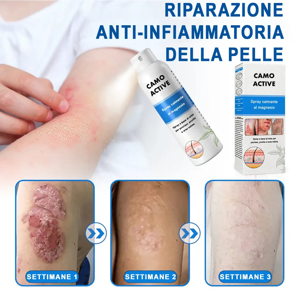 Negozio ufficiale: Camoactive® Spray per la Psoriasi (Allevia psoriasi ed eczema, migliora le infezioni batteriche nella zona genitale, tratta acne e verruche, allevia dolori articolari e dolori neuropatici)TrustScore 4,9 | 3.653 recensioni 🎁 Ogni giorno: I primi 100 clienti che effettuano un ordine riceveranno un prodotto in regalo! 📢 Rimborso completo al 100% entro 180 giorni, senza alcuna domanda, se il prodotto non funziona. Sicuro per l'uso su tutto il corpo: adatto a tutti, inclusi i bambini sopra i 3 anni. Delicato su tutti i tipi di pelle: sicuro anche per la pelle sensibile. Nessun effetto collaterale: non unge, non è comedogenico e non provoca ricadute o peggioramenti. Nessun farmaco o intervento chirurgico necessario: allevia prurito e dolore in soli 3 minuti. Trattamento topico comprovato: