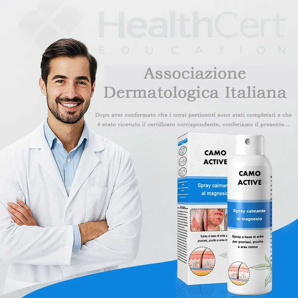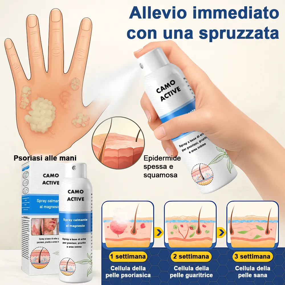 Negozio ufficiale: Camoactive® Spray per la Psoriasi (Allevia psoriasi ed eczema, migliora le infezioni batteriche nella zona genitale, tratta acne e verruche, allevia dolori articolari e dolori neuropatici)TrustScore 4,9 | 3.653 recensioni 🎁 Ogni giorno: I primi 100 clienti che effettuano un ordine riceveranno un prodotto in regalo! 📢 Rimborso completo al 100% entro 180 giorni, senza alcuna domanda, se il prodotto non funziona. Sicuro per l'uso su tutto il corpo: adatto a tutti, inclusi i bambini sopra i 3 anni. Delicato su tutti i tipi di pelle: sicuro anche per la pelle sensibile. Nessun effetto collaterale: non unge, non è comedogenico e non provoca ricadute o peggioramenti. Nessun farmaco o intervento chirurgico necessario: allevia prurito e dolore in soli 3 minuti. Trattamento topico comprovato: